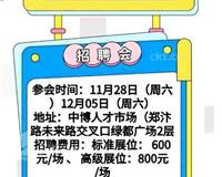 郑州大型现场招聘会参会时间: 11月28号、12月5号地址:未来路郑汴路交叉路口绿都广场联系电话:13676934525..